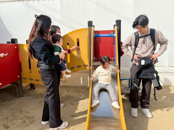 ばらぐみ(0歳児クラス)のおともだちと一緒に砂あそびをしたり、すべり台をすべったり…。